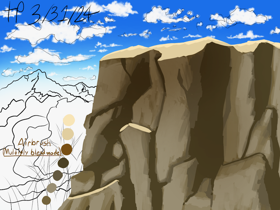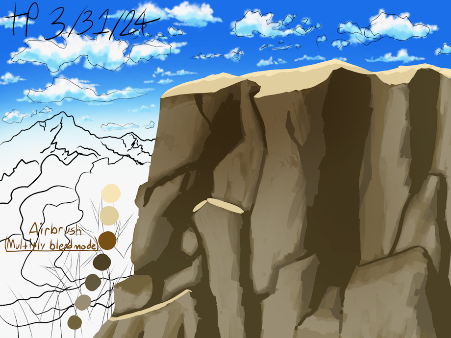 Most of the colors I used for the clouds, mountains, and trees were re-used from some of the previous BG practice illustrations I made. They were determined by saturation and mood using the hue shifting method(which is usually for pixel art).