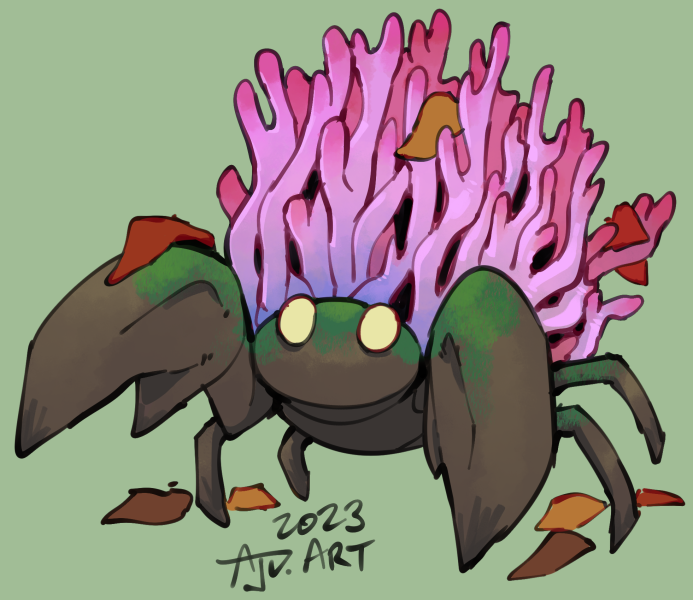 Violet Coral themed Parasect, I figured after playing with the Paras design that it would be really cool to see more paras/parasect pokemon with other fungi types on their bodies. I thought the violet coral would look really beautiful and I WAS RIGHT! Lil parasect has a bunch of gorgeous horns now! This big one has been sold and has a great new home.