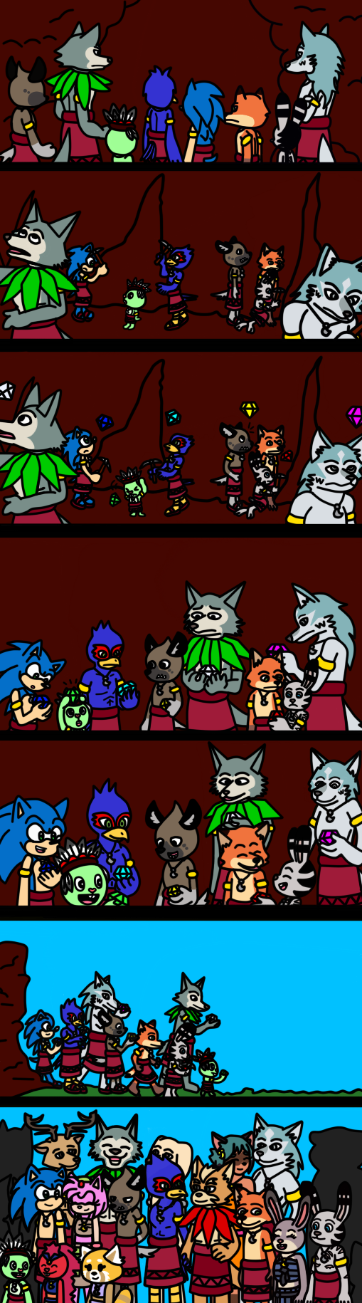 This pic is a collab I made with my friend sirinathehedgehog. This is a comic that came to mind based on an idea I had for a fic from another fandom where it would show what it would be like if the characters of a fandom x lived in a tribal environment. Also, this is a crossover comic between Sonic The Hedgehog, Star Fox, Happy Tree Friends, Zootopia, Aggretsuko, Beastars, and BNA Brand New Animal. Although there are other fandoms included here. This is the twenty third page.