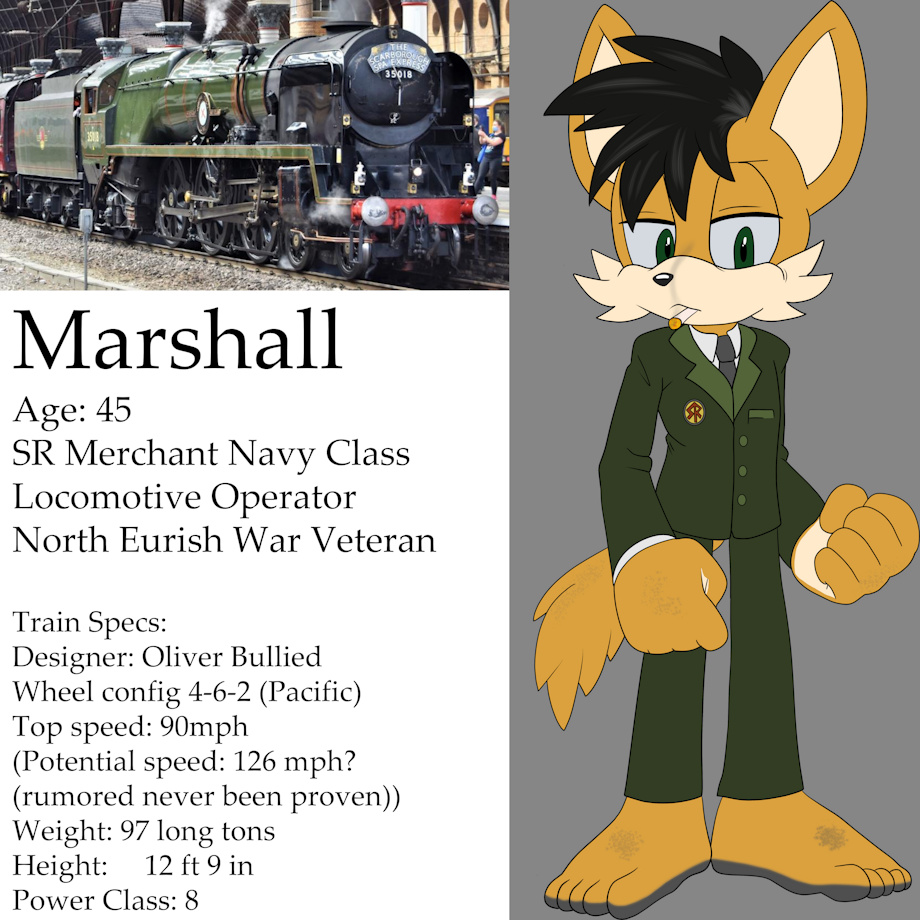 The young apprentice who works the SR is Marshall the Dingo, a middle-aged war veteran. Marshall was deployed into a coastal platoon as a young man, responsible for protecting trains like Pierre's. He had become fascinated with the train system ever since, and quickly took to it once the war ended. Marshall's platoon was a barefoot unit due to needing to be on the move constantly, as well as allowed them to keep their feet drier during rest. This habit has been with him for years, even now in his middle aged life.