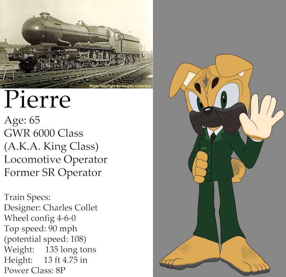 Pierre the Pug started off when Mercia had one main railway, as a young immigrant from the mainland. He took to it with ease, making himself quite well liked among the cabin crew. During a war that broke out in Eurish, which roped Mercia into it, Pierre was the one making sure the train still operated and helped the engineers as best as he could.
