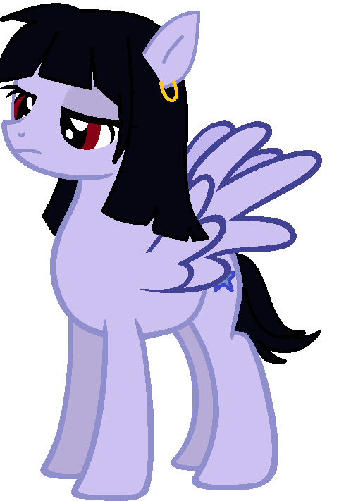 she is a pegasus of the night thats why she has the star cutie mark.she is a light purple color and has red eyes mostly has a scowl on her face