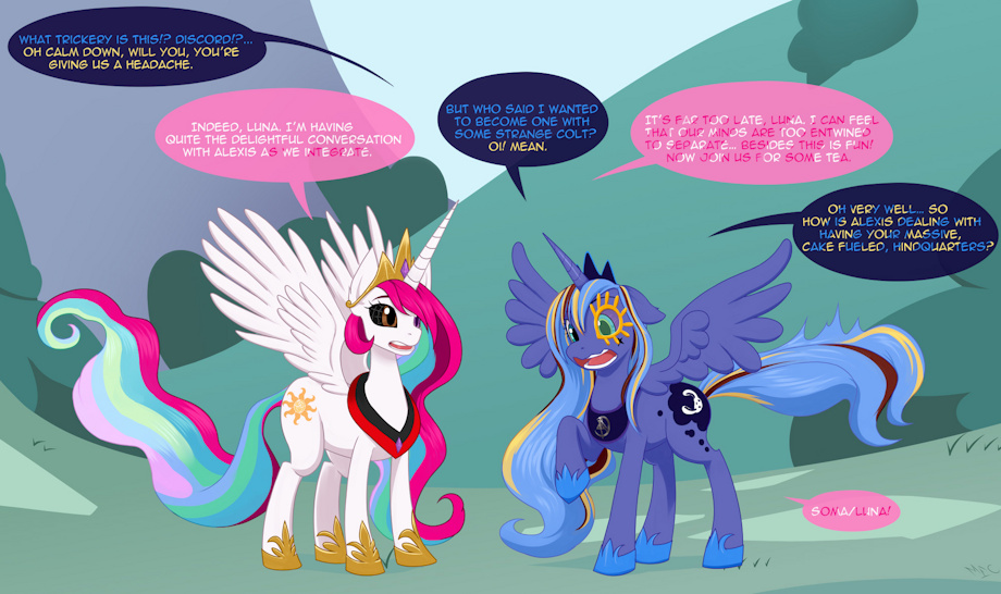 TheRoseQueenAlexis & SomariaMoon got turned into Celestia and Luna respectively, or rather fused, or "integrated" as Celestialexis says, Celestia of course taking with ease and dignity, while Somaria Luna feeling like fighting back, at least at first.