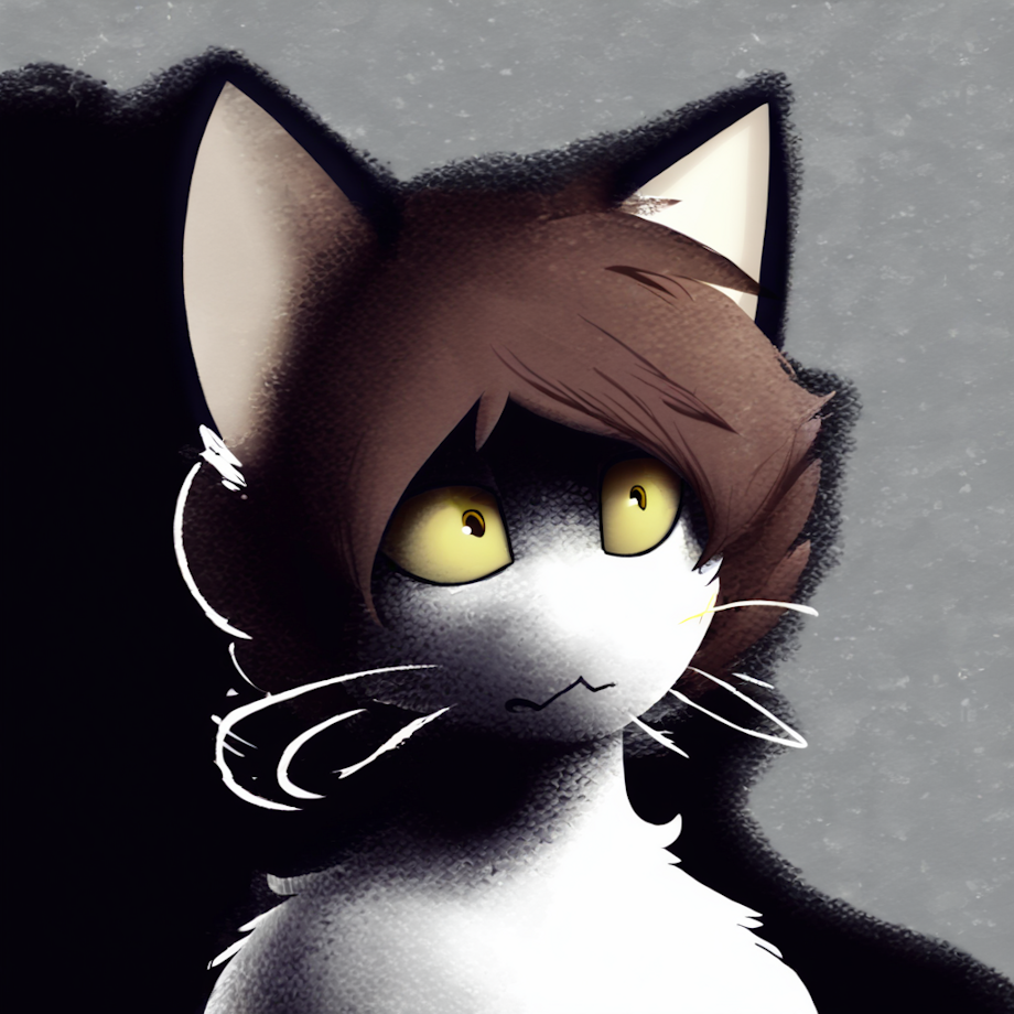 brown hair, surprised eyes, yellow eyes, tuxedo cat, white muzzle, <lora:PDXL_artist_tags_v2_big:1>,