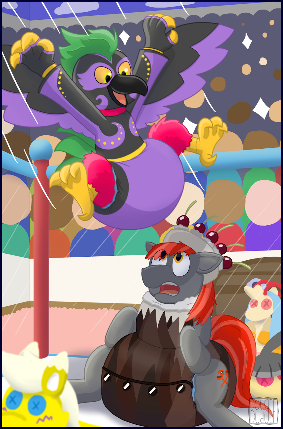 And Zor probably should have chosen a better outfit for this match than the Cakesie, Luchas here with his full Luchador getup about to perform his Flying Press onto Zor. Zor better brace for impact, as this cake is going smush!