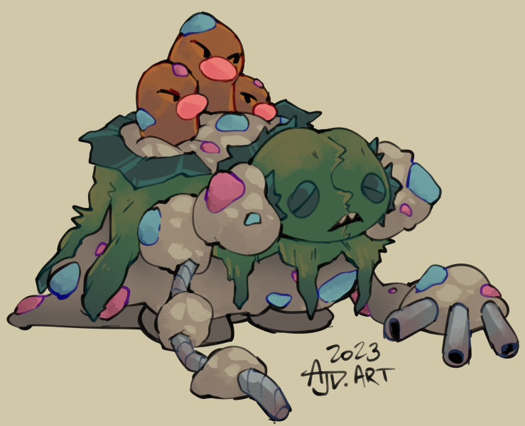 Parasitic dugtrio! It seems this rare specimen of dugtrio found itself trapped in a garbodor's body, with sheer determination the dugtrio managed to burrow it's way out of the garbodor's body. Though something even stranger has happened, now that the dugtrio can successfully escape it's predator, it remains. The body beneath it making extreme efforts to feed itself and the three heads on it's back. As the colors wilt on the garbodor, the colors grow stronger and richer on the dugtrio. Available for sale on the CloverCoin Toyhouse!