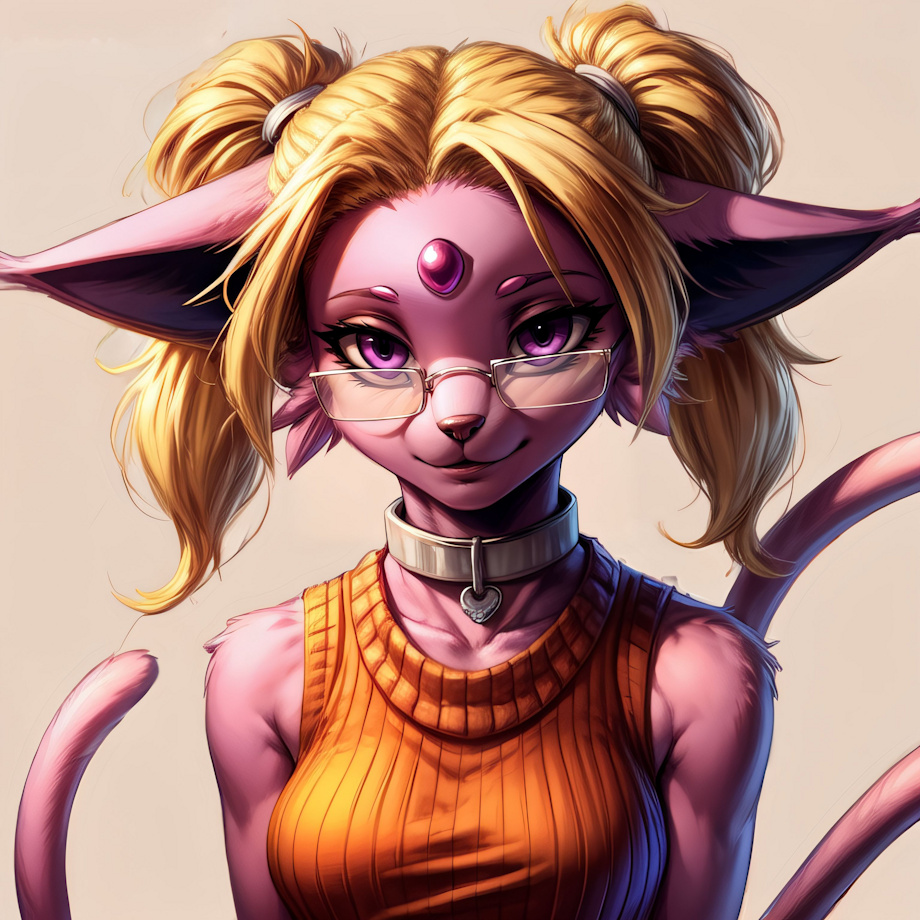 Body: Slender, Small Breasts, Long Legs, Sleek Pink Fur, Red Forehead Gem, Dual Tail,