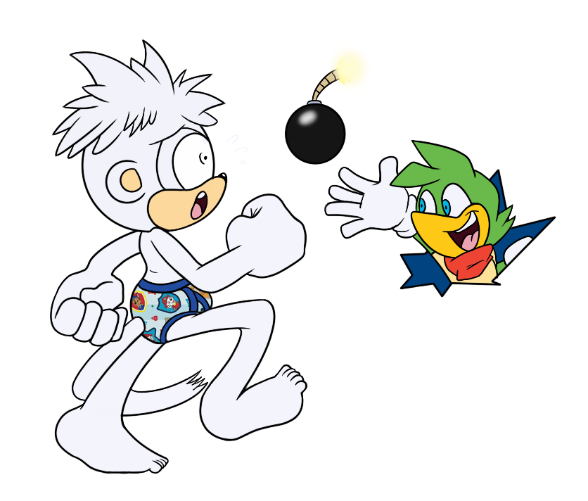 His eyes widened and looked down at it, noticing that there was indeed another bomb in his maw. He whimpered as it exploded and sent him soaring through the air again. He peed his newly acquired diaper right as his head slammed through a mailbox.