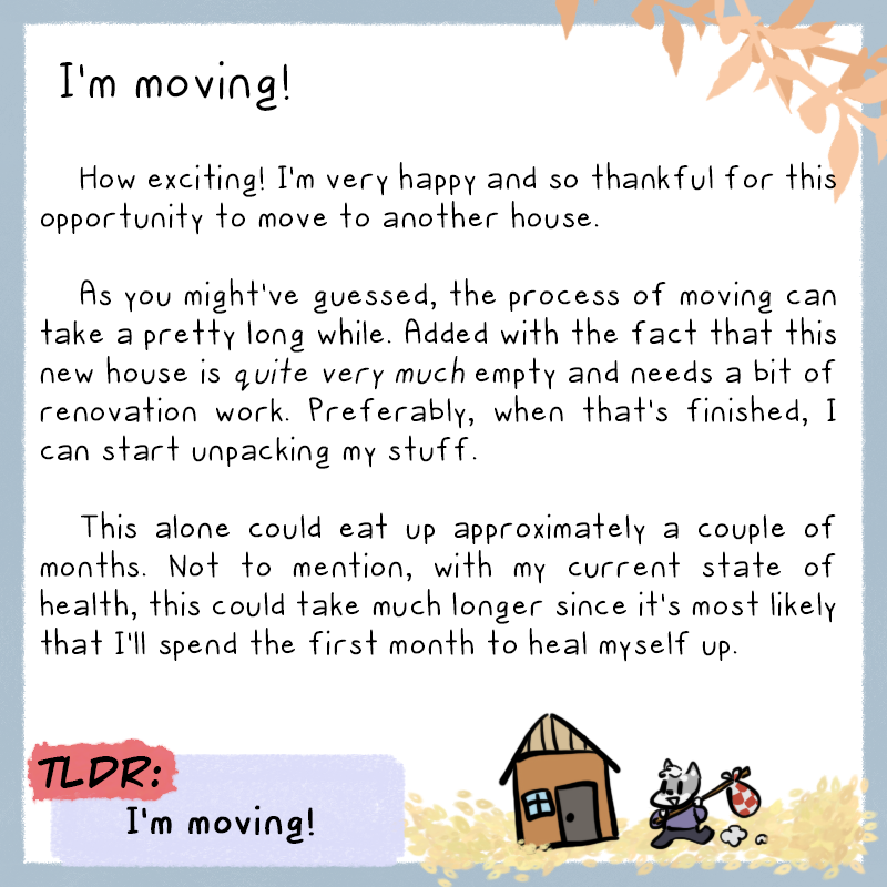 I look forward to your future work always and love the work you've already done and your excellent characters. Please take care and make sure you get lots of rest and recover, moving is always stressful.