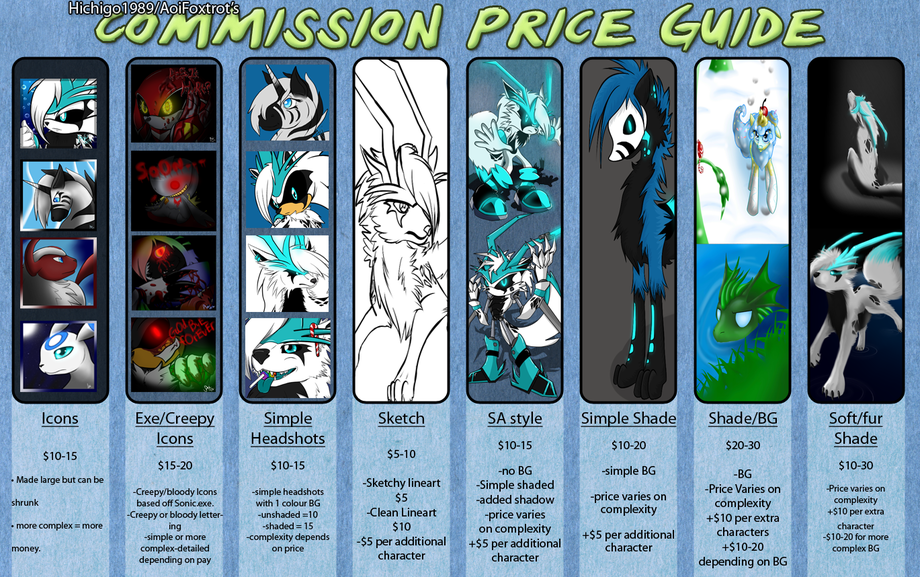 I put together a price guide cause it looks more fancy then having journals about it. Prices are not set in stone, they just sounded good to me at the time I put this together ><