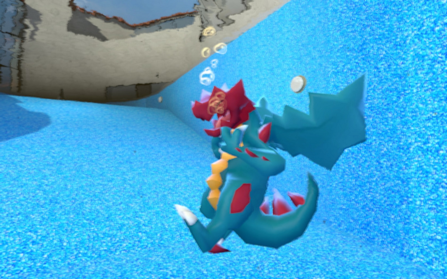 Druddigon wanted to beat his record for the most laps done in one dive, though it's been a while since he'd practiced. As the minutes passed, his lungs struggled more and more, eventually burning... But, he absolutely refused to give up, and as he approached his record, his lungs gave out entirely! Grabbing his neck as he let out a flurry of stale bubbles, Druddigon thrashed about for a couple seconds before bolting for the surface. He'd been so close, both to his record and accidentally taking in water... He really needed to get back to practicing.