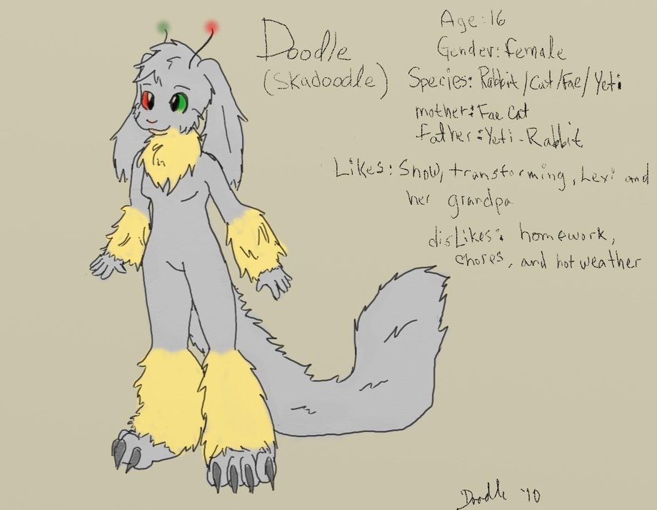 Doodle is a hodge-podge creature. She has dense grey fur covering her body with thick, long, and almost untameable cream fluff around her wrists, ankles and neck. She has long fluffy ears that hang down behind her head. She is has dual colored eyes, and fae like antenna of the same colors. She had a super long fluffy tail that is not prehensile but seems to have a mind of its own.
