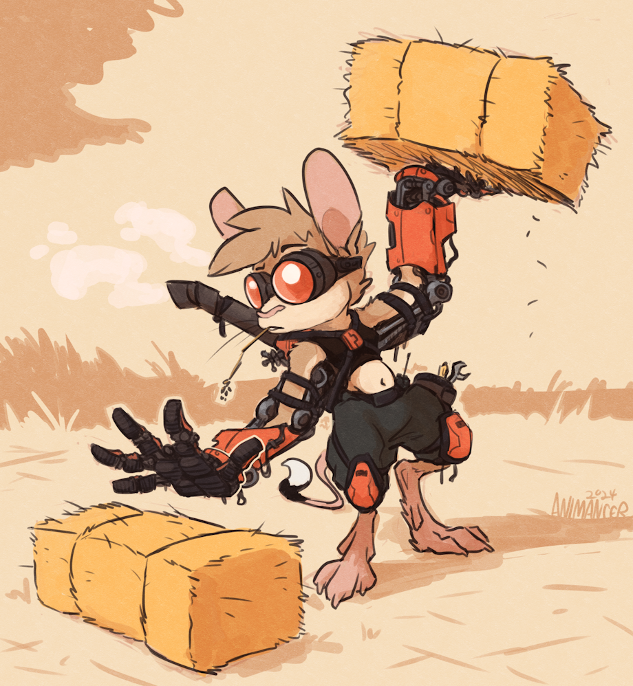 Helping Coonix flesh out his jerboa character Casey. Jerboas have short arms so it only makes sense a farm raised tech wizard would invent some stronger way of getting hay moved.