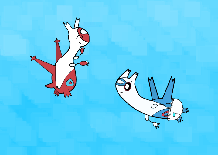 This Latias and Latios are brother and sister, and today they're flying together! It just so happens that, after a series of accidents, Latios has been put back in diapers, much to Latias' amusement. He's totally gonna get her back someday.