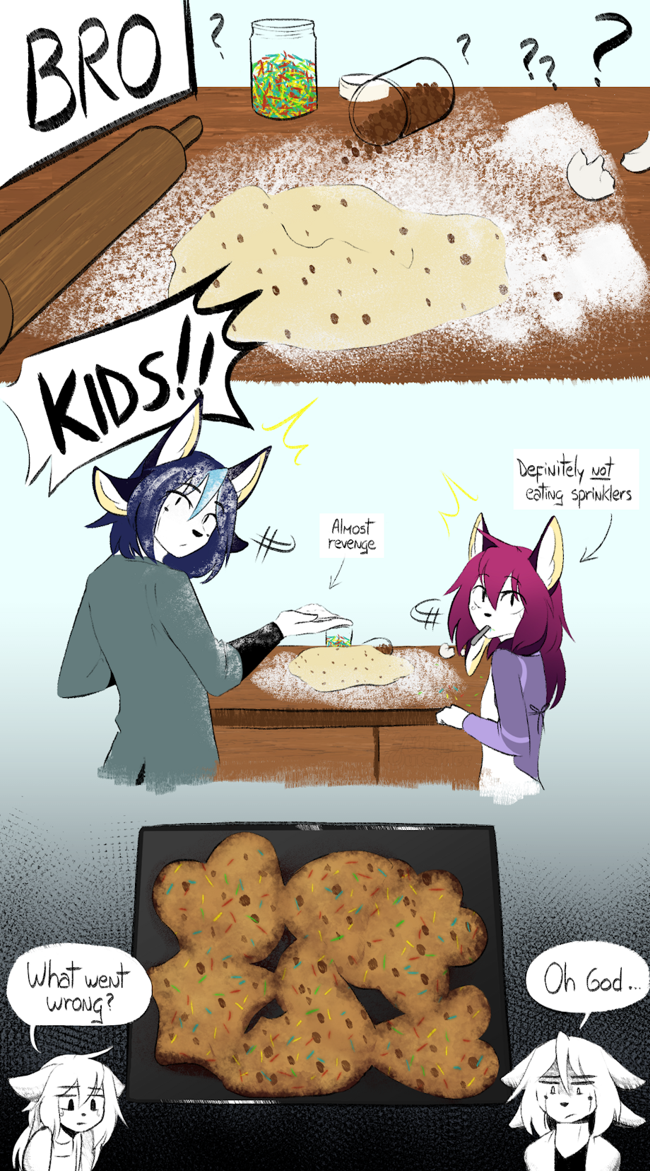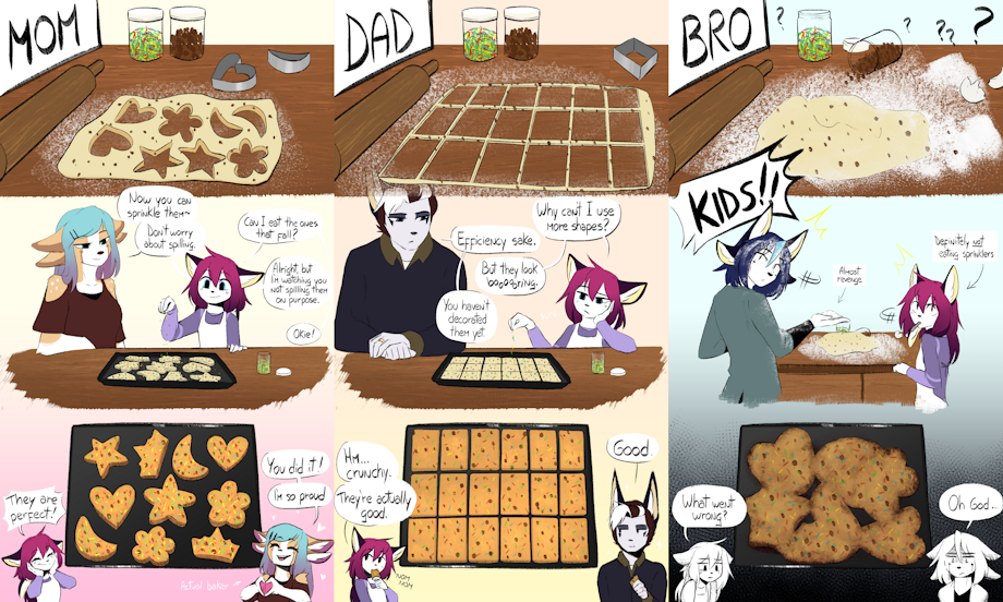 DAD: For Sargent, a metal worker, efficiency is key and goes before anything else. He made the majority of the job: was Melody struggling a tiny bit mixing the dough? He helped her. Flattening it with the rolling pin? Easy task for him. Using cute cookie cutters to cut it? Good thing he was near to tell Melody which shape was the most suitable for the job. She wasn't a fan of all that, but it got the job done. Cookies got baked in record time and were surprisingly good! Neutral Ending.