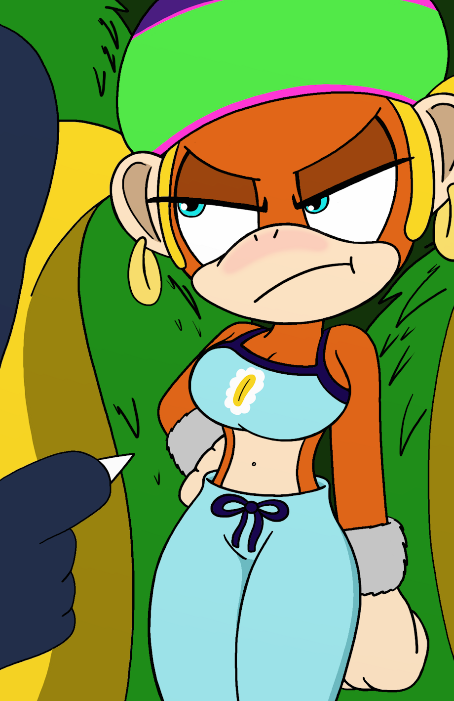 Tiny Kong was about to shrink the big muscular Krusha with her new shrink ray to set up the events that followed in the previous images, but this time Krusha used his head and quickly complimented the young kong, calling her pretty to avoid becoming the size of her toes. He wanted to tell her something interesting. She stopped mid-aim and lowered her weapon and stared suspiciously at the big Kremling, ready to punch him or shrink him depending on whatever it was that was interesting. He told her that he's looking for Donkey Kong to tell him about King K. Rool's new plan to make the kong's lives miserable again and how to prepare for it. Did this Krusha defect from K. Rool's army as a traitor? Whatever the case this is something Tiny was willing to hear. She made sure that the Krusha couldn't escape and he knew it. He started explaining to Tiny that he needed her help to thwart K. Rool's plan in advance and that he brought a special device with him. Tiny started getting cautious, but still listened to what he was saying. He prepared to show her this device he mentioned...