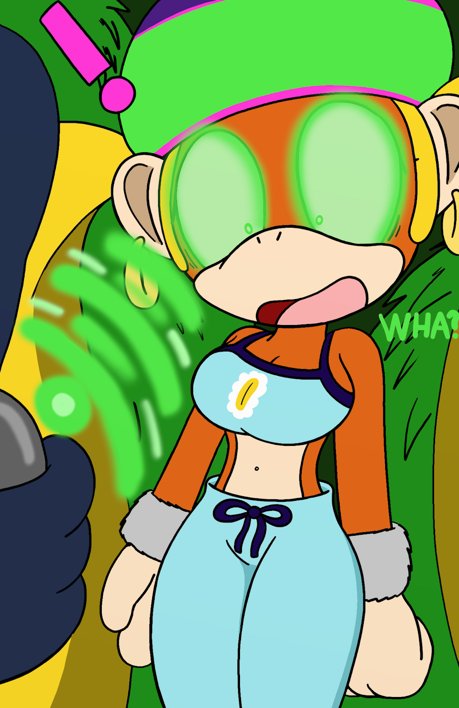 The Krusha then pulls out a device and says to her that it'll temporarily grant her super senses to locate hiding Kremlings on DK Island. Sounds like an interesting ability to have. Still very wary and cautious of this she allowed him to use it on her. Tiny noticed the device up close and saw a specific label on there near his claws. There were swirl symbols on the device. It was a mind control device the whole time. She was tricked. She immediately readied to pull out her shrink ray, but unfortunately the Krusha already activated the device as she was about to act.
