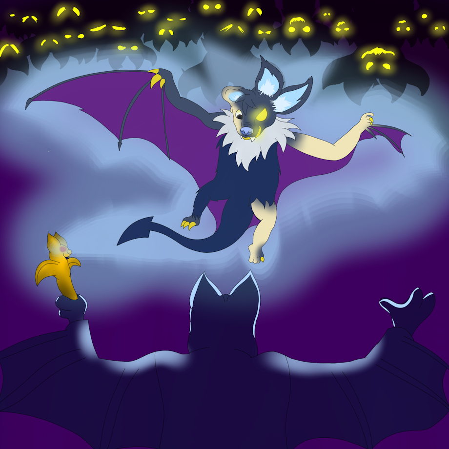 Our Hero got hired to clear a nearby cave from a mage who hides there. Unfortunately the mage was way more powerful than expected and he wasn't the first hero they hired. He realized it to late as he got caught up in the speel lifted up into the air and changed to meet his new master expectation. Ears grew so he could now notice the screams of his new friends in the back and his eyes changed to match their glowing eyes. Soon the bat mage would have enough minions to overtake the lands around him to strengthen his position.