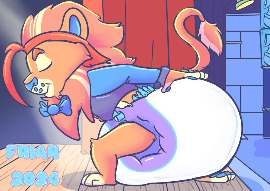 Illustration of Lloyd the wet and messy diapered lion taking a bow at the end of a performance in front of the stage. The backstage can be seen, with stacks of diapers visible on top of containers.