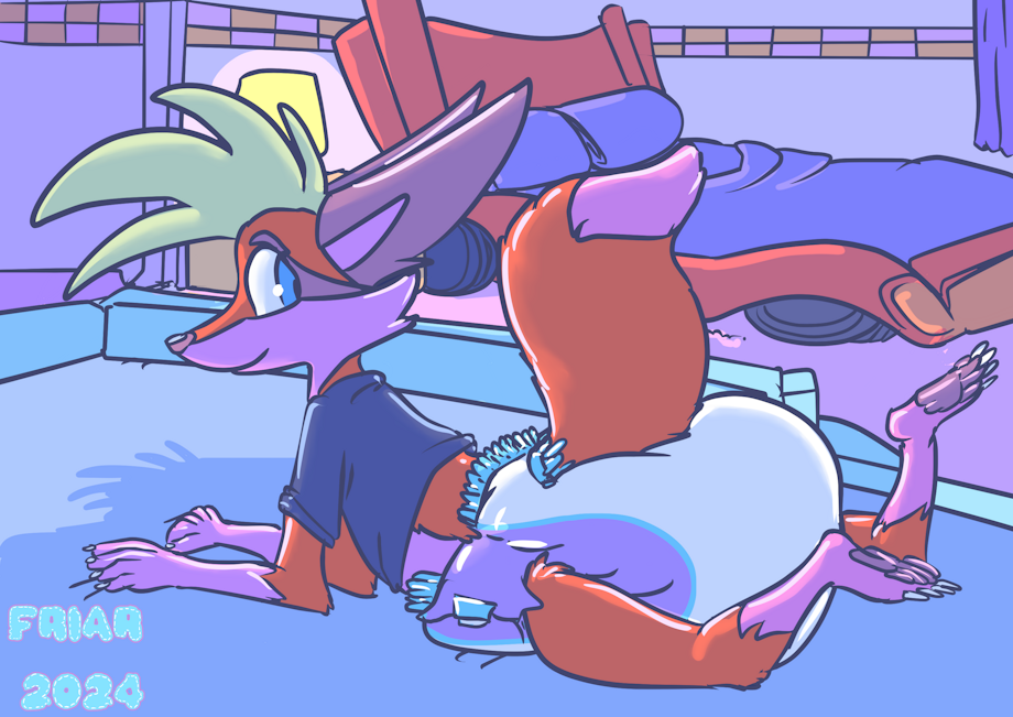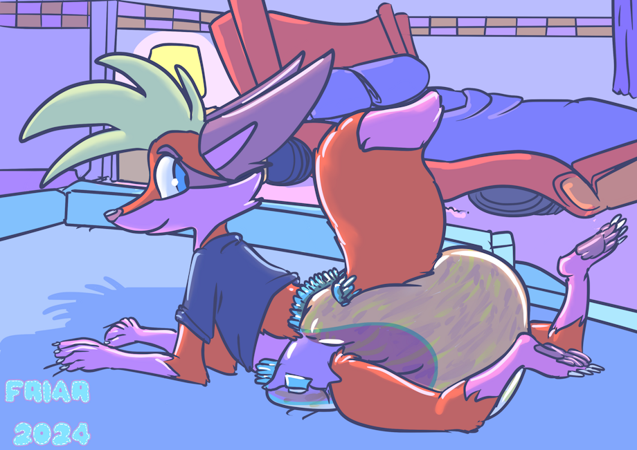 Illustration of Berry the wet and messy diapered fox flopped on his tummy on the changing table in his bedroom, looking at the viewer.