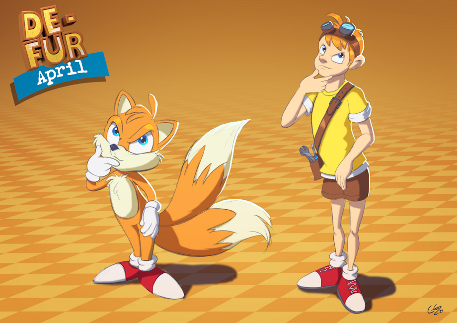 A bit late but here is Tails as a furry and a human. Re-did the background with better smaller checkers, now I'm much more happy with it. Also did some tweaks to the 3D-logo so it's easier to work with for future de-furs. Next up will be a purple dragon!