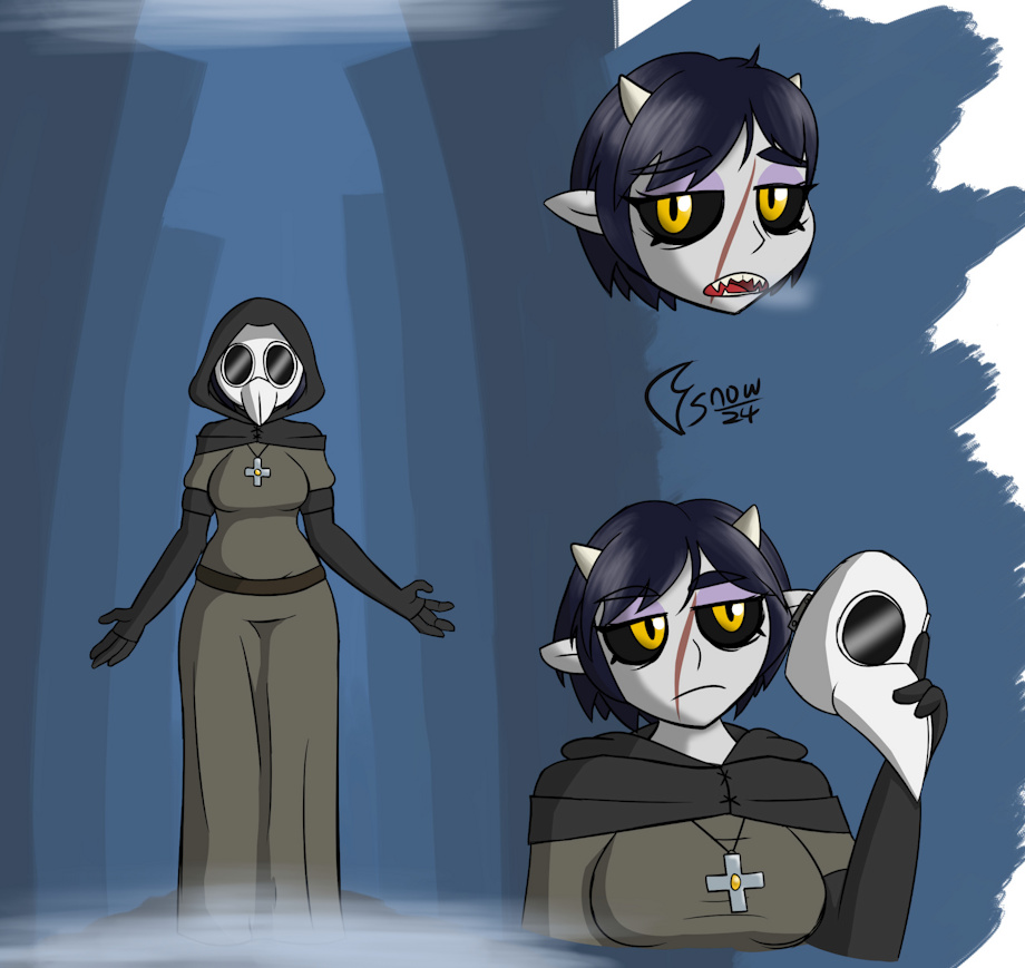 This is the original version of my plague doctor character, as a half-demon human. Before I decided to change her species.