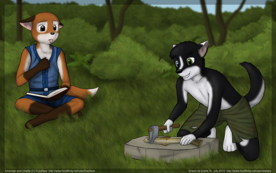 The duo you see here are more talented then they appear. The wolf cutting the fish is nine years of age, dubbed the name Challis, (His real name is Kayos Ingine, but he doesn't like that name, so shh...) while the book holding fox has witnessed ten, he would rather go by his nickname, Amender, (A shortening of Anglo-Nereman Mender. he curses his long winded full name.)