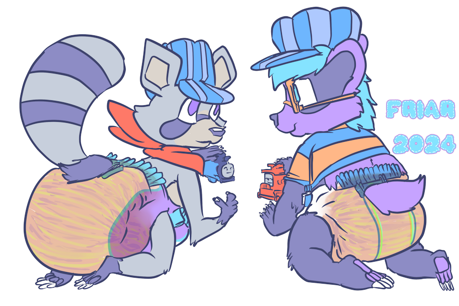 Illustration of Rambley the wet and messy diapered raccoon and Everett the wet and messy diapered badger playing with trains. Everett is playing with a Bruno train and Rambley is playing with a Thomas train, and both are wearing conductor hats behind the couch.