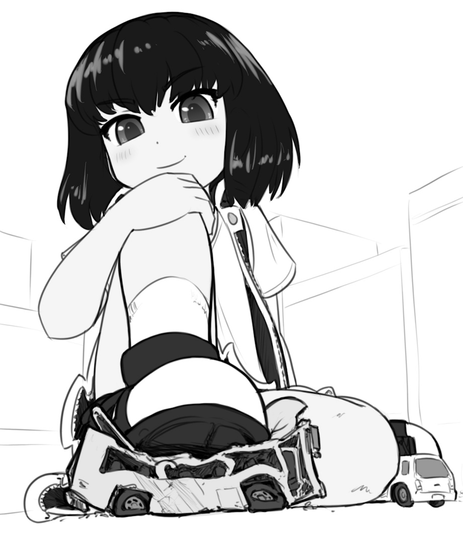 I like the pose here, it's cute and unique. That car right next to her knee was spared... for now! The bus being gradually pressed into has some nice detail going on the gradual crunch end as the tires come off and the roof buckles. Rem's very proud of her handiwork! The lineart here was a lot faster than normal thanks to your experimentation, but I do definitely think this technique'll take a little bit of refining. Nothing you can't pull off, though!