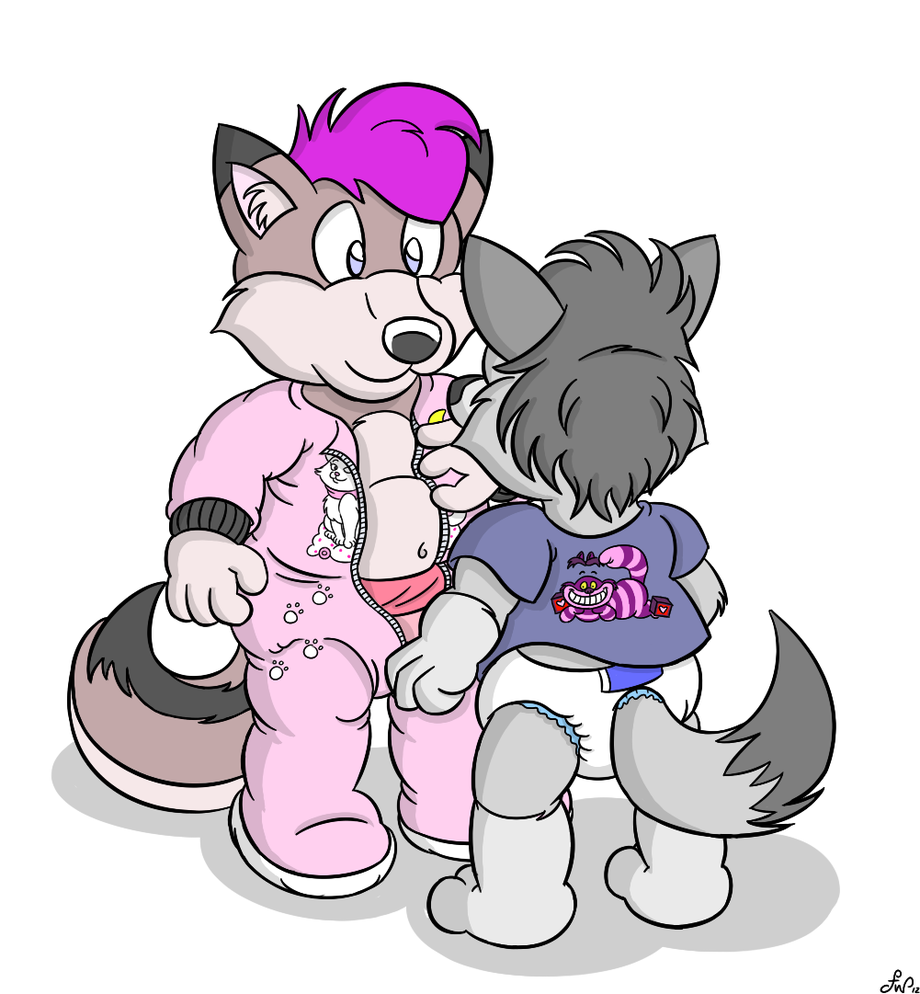 Loupy dress up Wylf as the little (even if he is taller than me) sissy he is. We may be wolves, but cats fit us nicely. Great job on the cats, and the Cheshire one in my back is quite fitting.