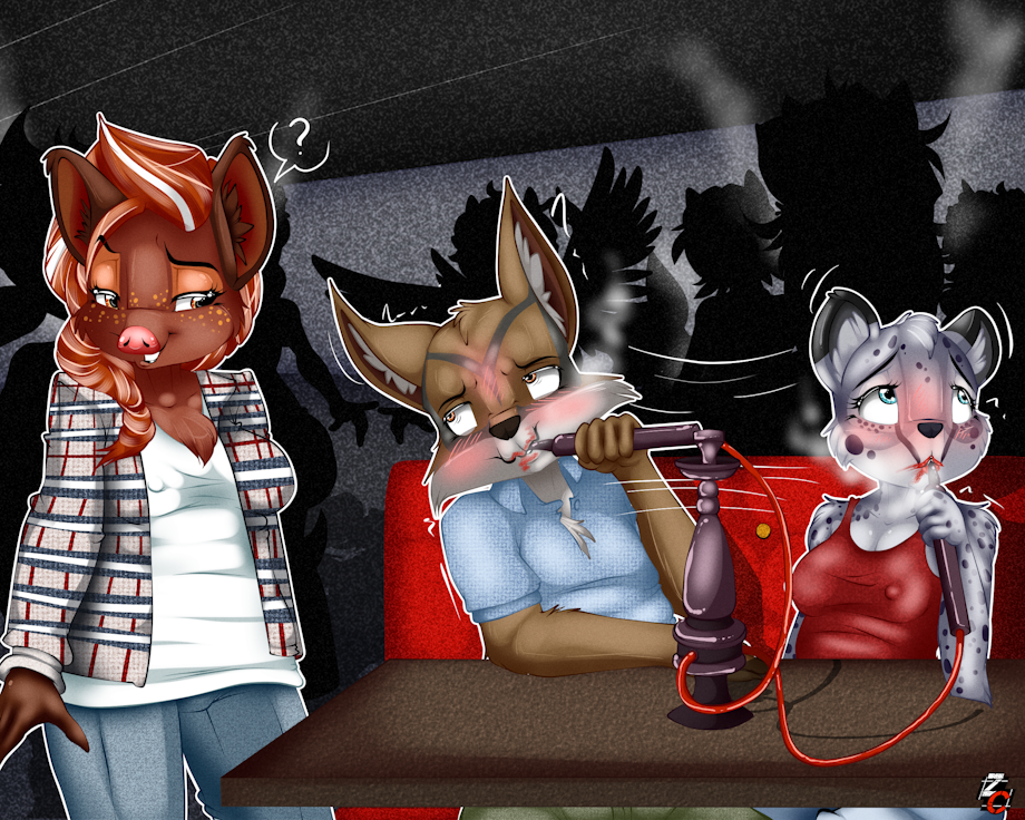 Lindsey drove them to the hookah lounge. It's a place run by one of the guys from her brother's squad. She asked him for a special blend. It has a mild aphrodisiac mixed in. It would be pretty ineffective for anyone other than canids or felines. The lounge had a high ceiling, lots of fans, and good ventilation. As any place like it would have to have. It wasn't crowded but that was perfect for what Lindsey wanted.