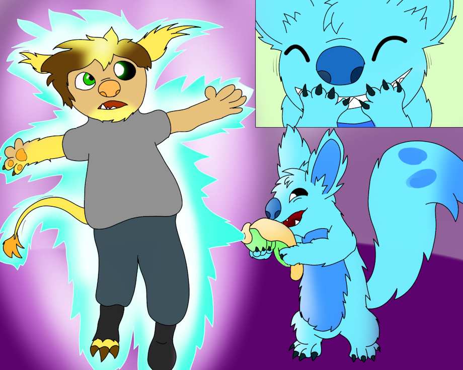 An arttrade i did with https://x.com/Clancy_boyo Uba tried out a new Cousinmaker he found and Clancy was the perfect target for it, but after he became small and fluffy he figured his new ability out fast but Uba into trouble. But three against one is no fair or what do you think ?