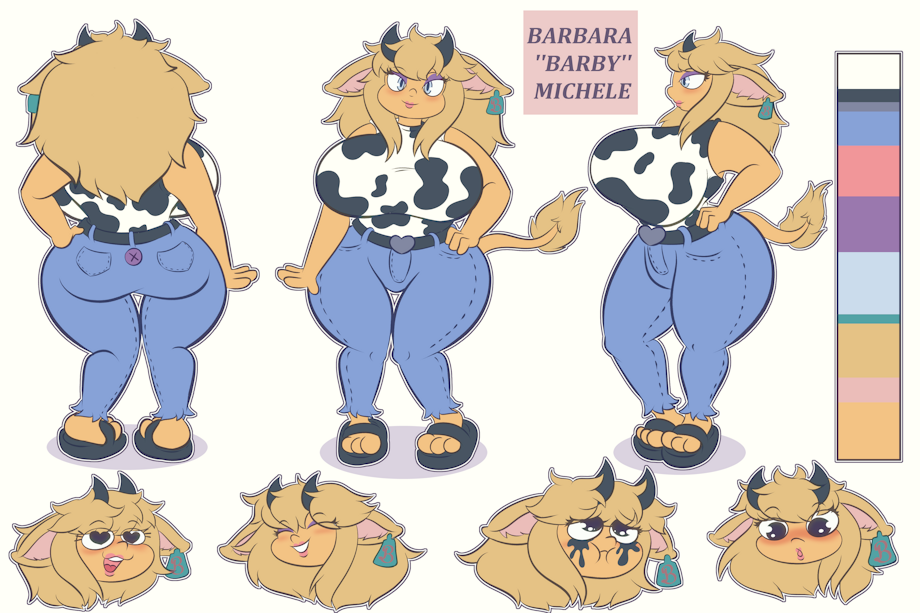 Member of the most important family of cow people (In the world where Nars lives). Despite being one of the heirs to the Michele's Lecheria fortune, she wants to be a famous Instagram influencer, although in her spare time she helps her parents at the factory. All the women in her family have the inheritance of TWO GREAT charms. Despite her status as a privileged girl, she is impressed with anything that is outside her circle of luxury. She has a feeling of overprotection with the people close to her, mainly with her younger brother. Her best friends are Dalia and Emi. She is Bisexual, but she likes boys more. She likes fashion and walking in the park. She hates lemons but she loves lemonade 🍋 She only drinks water if it comes from a Stanley thermos, otherwise her blood pressure drops. . . . Well, that's it Barbara ⭐ Soon I will make character sheets for her friends ❤️❤️❤️