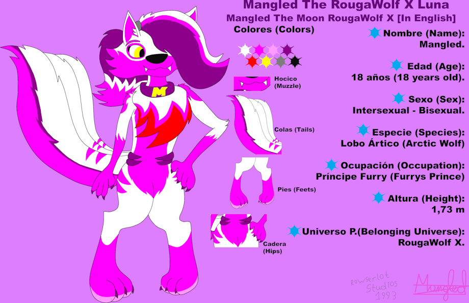 Aquí os muestro la Referencia de mi personaje principal Mangled The RougaWolf X Luna, la referencia está en Español que es mi idioma natal pero también la puse de una vez en Inglés para que así ambos idiomas puedan entender la referencia del personaje e incluso se puso el apartado de colores los cuales se usaron para colorear al personaje y se muestran las partes del cuerpo del personaje para que así se puedan fijar en todos los detalles que el personaje contiene y para que no dejen detalles por fuera al momento de crearlo.