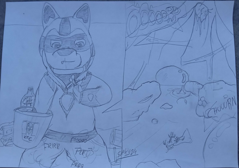 Riolu took 15 chicken wings, a large fry a large soda and a bottle of cola 1.5 Litter plus a small chicken burger as a side, he's having an absolute blast his tastebuds are loving it and his stomach also love it being full in digestion, the meal being about 75% digested.