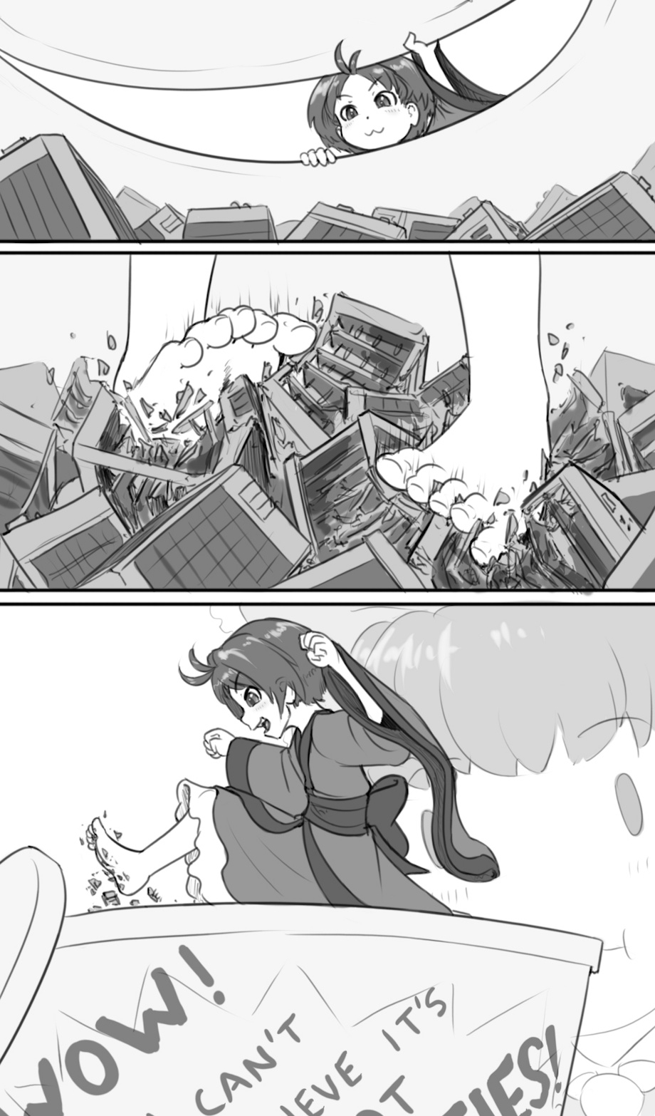 The pouty Reimu in the back is hilarious. Also, excellent Sukuna faces of gremlin satisfaction. Cute little feets! Nice going on the mess of assorted buildings being busted up and how her toes bend around the snapping structures, the mixture of shots here are effective in many ways!