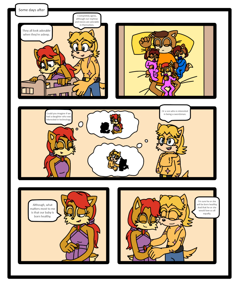 The comic takes place in a universe similar to that of Archie Comics in the Pre-SGW continuity, but with a few differences, including Antoine's appearance and that there will be characters from Sonic Underground and Sonic X here. This is the thirty-fifth page. This page can be considered as an image for Father's Day.