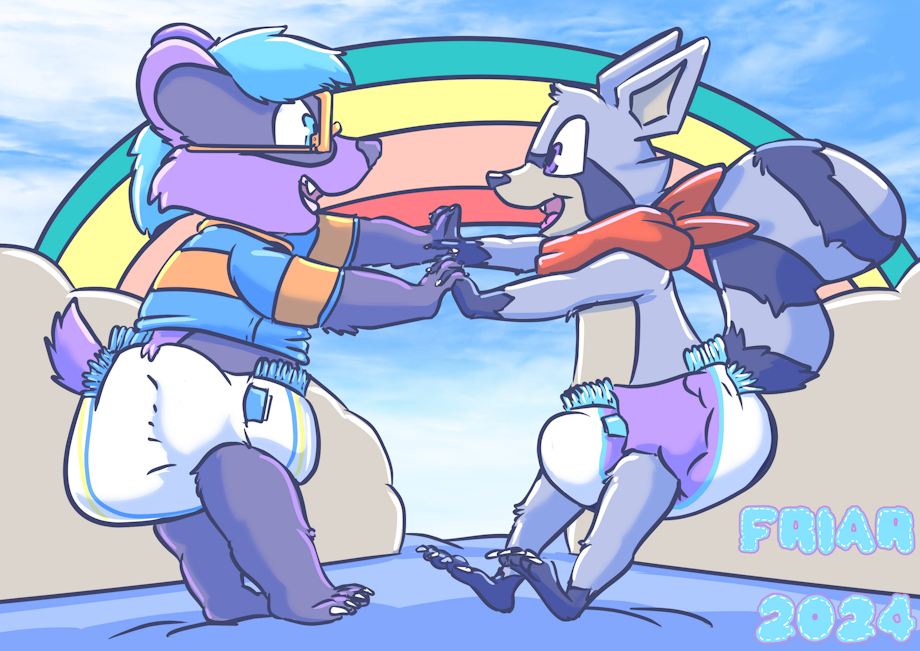 Illustration of Everett the wet and messy diapered badger and Rambley the wet and messy diapered raccoon holding paws in front of a rainbow and clouds background.