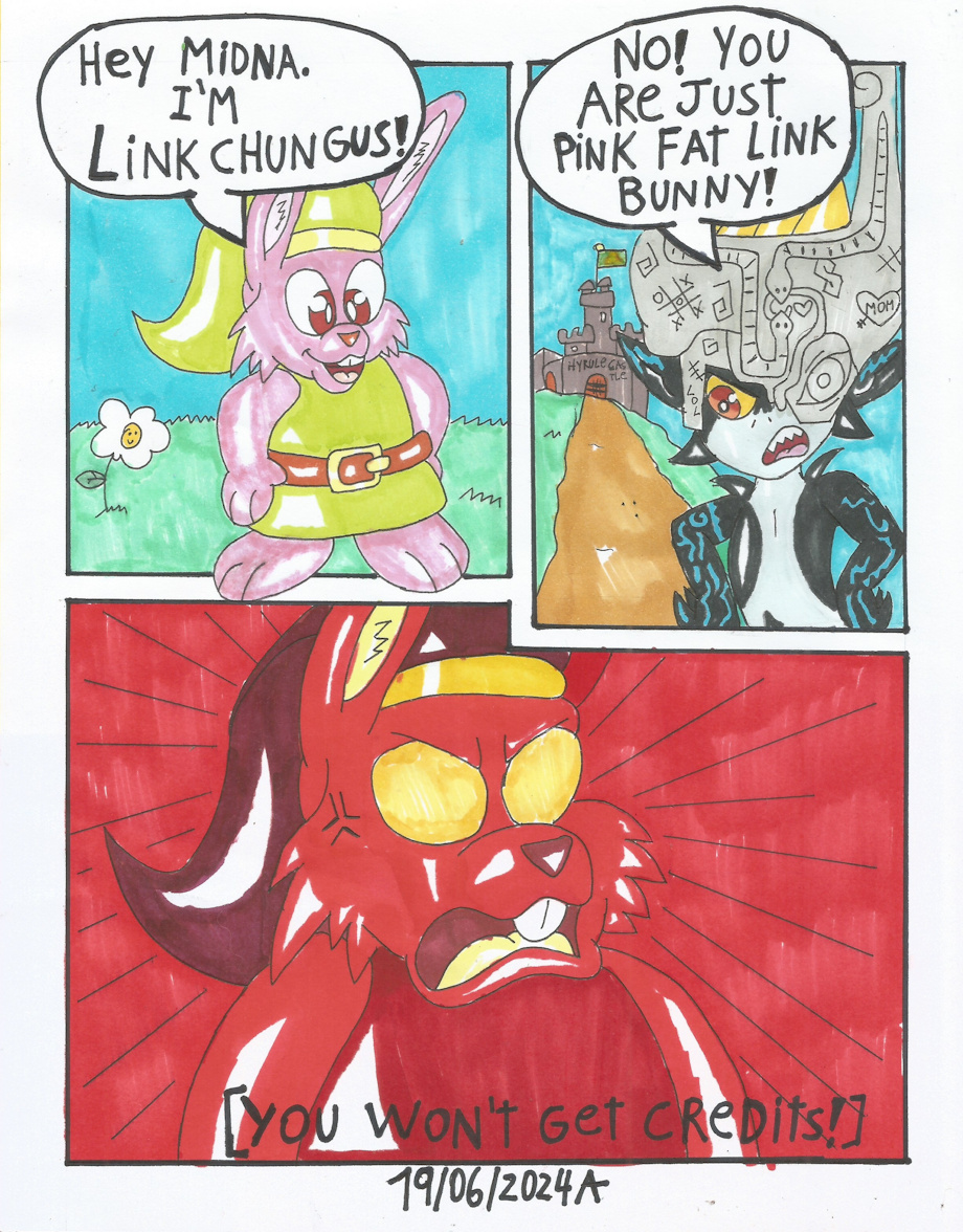 Es un chiste personal. Cuando jugue TLOZ y porfin llegue a la fase donde Link se convierte en un conejo rosado sin saber nada de lo que pasaba. Lo llame "Link Chungus" por el meme. Nótese tambien lo bien "detallado" que esta el casco de Midna igual que el original. Saludos y sigan dibujando.