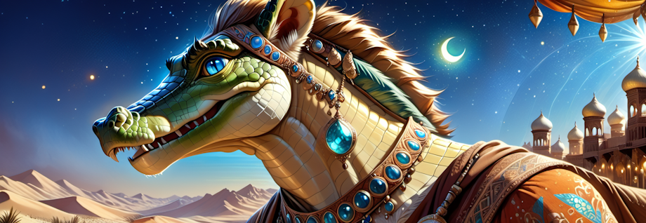 A digital painting depicts a crocodile-like creature adorned with jewelry, looking towards a city in the distance under a starry night sky. The creature has a warm, golden hue, and its blue eyes sparkle. The desert landscape and distant city are illuminated by the moonlight and twinkling stars.