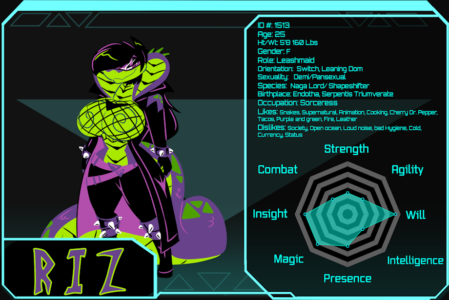 Not every Naga lord has the coil for legs. Though Riz's abilities allow her to shift into whatever forms she wants, some things always stick around. namely her color scheme. To erase any trace of herself would take considerable energy and focus, more than she's willing to give most of the time.