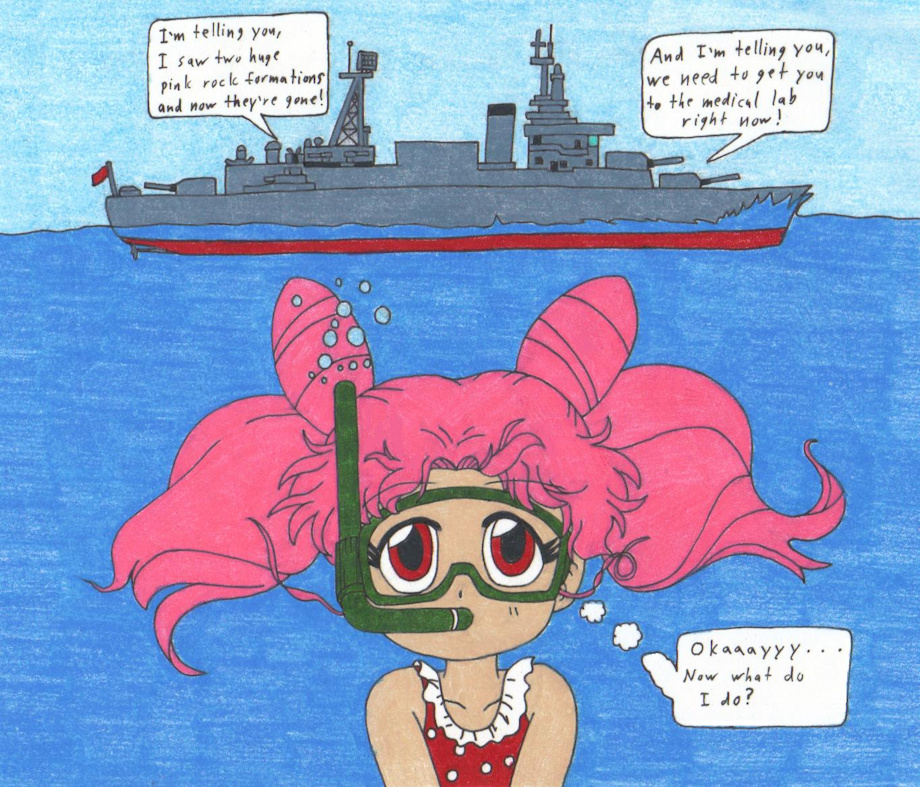 A silly picture of Chibiusa hiding from the ship instead of attacking it immediately.