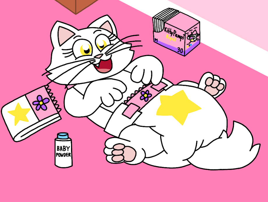 Sparkles is laying down, showing her belly and diaper.