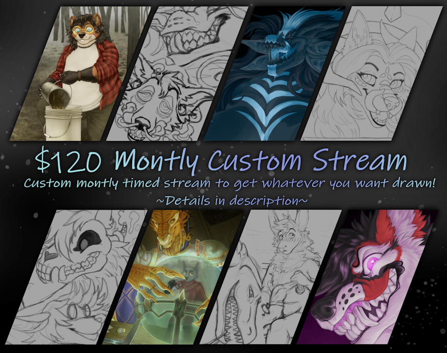 Do you enjoy receiving art regularly? How about watching it get made live?? Join my monthly Sub program today! As long as you are signed up you'll receive a timed stream day every month where you can have ANYTHING you want drawn instantly AND you'll get to watch it get made LIVE! You can also give me feedback and request changes or edits while its getting drawn! :3