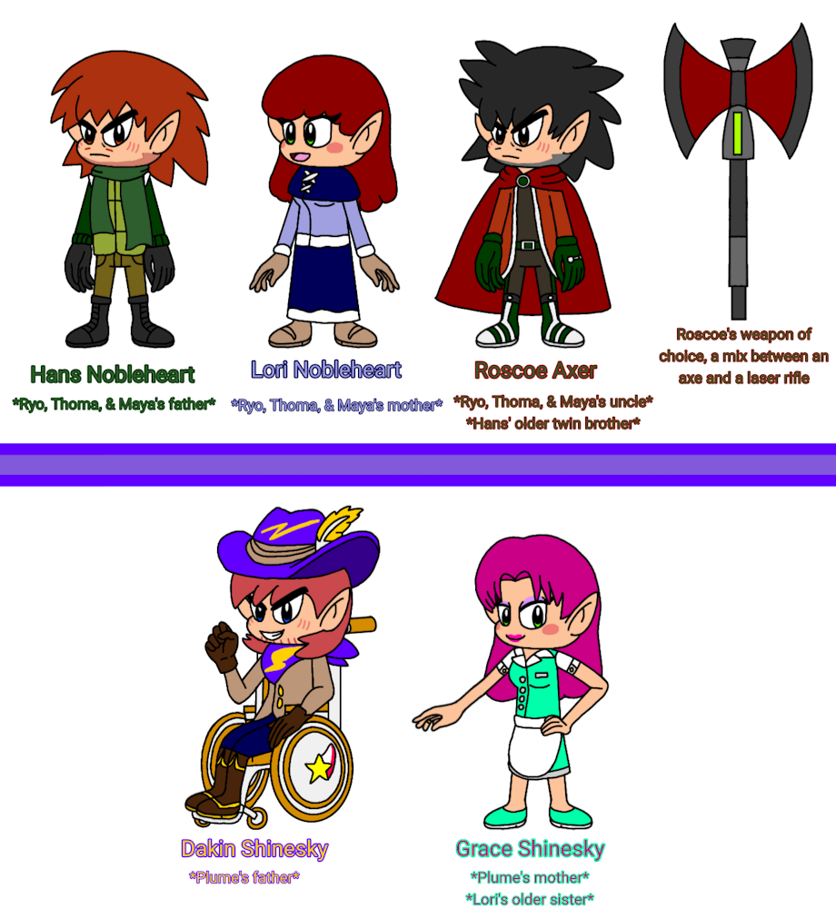 Roscoe's weapon is an axe that also acts as a laser rifle, he built it himself. - Grace Shinesky *Plume's mother, Lori's older sister and Ryo, Thoma, and Maya's maternal aunt* Age 35 English Voice: Laura Post *Marguerite Behlmer from Atelier Sophie: The Alchemist of the Mysterious Book* https://youtu.be/RZ_GYTRKR7I?si=hz1vRzCqBrMLqnVi&t=198 Japanese Voice: Yuriko Yamaguchi *Nico Robin from One Piece* https://youtu.be/DrYGVag62Pk?si=mbscWK-trHvWC1E_&t=8