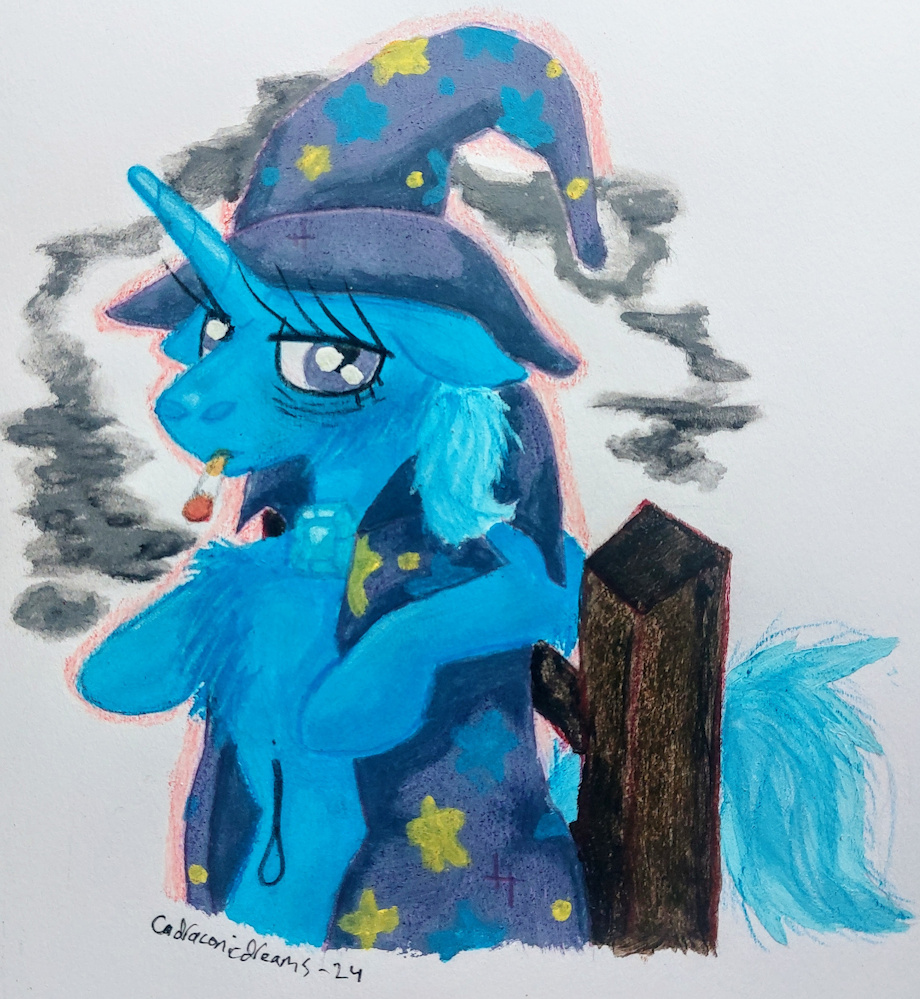 Looks like you happened to bump into Trixie during one of her show's intermissions... piece inspired by the PrinceWhateverer song above, specifically those lyrics, which I feel fit Trixie perfectly - poor mare has been through a lot, of course she's tired and needs a smoke... mixed media sketchbook, acrylics, (watercolor) colored pencils, oil pastels, varnished with workable fixative. Not specifically listed for sale, but I'm willing to sell for the right offer.
