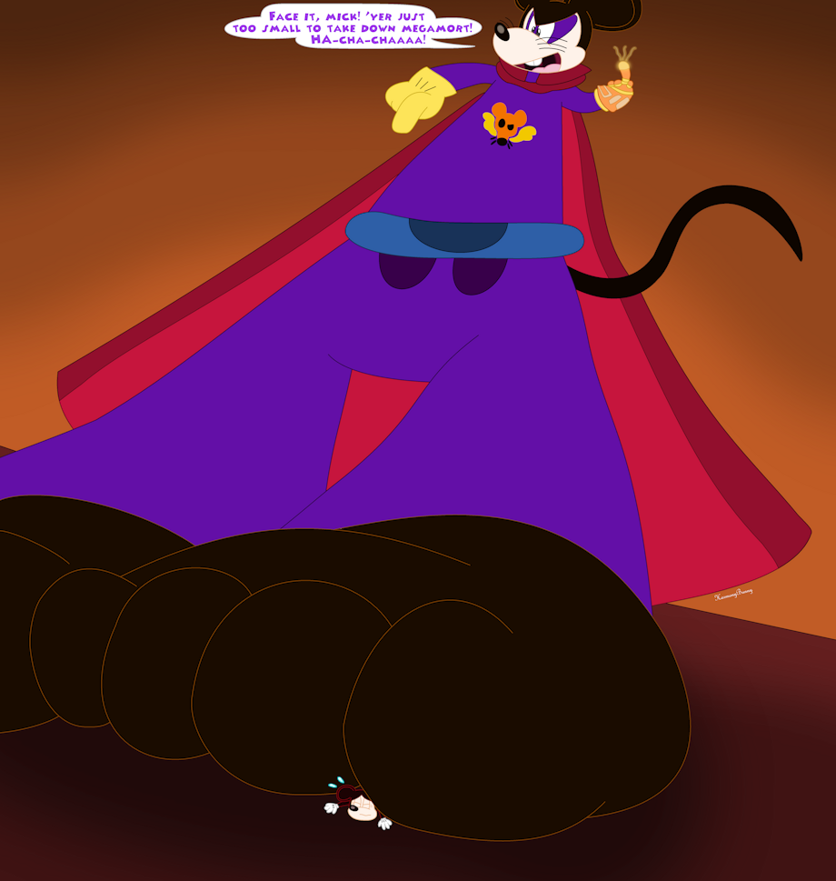As suggested by a friend of mine on DeviantArt through private notes; they asked for Megamort dominating over the tiny Mickster by trapping him under his massive toes. Clubhouse wouldn't show you this due to its kid-friendly nature but it's a missed opportunity seeing that Mortimer has the ability to shrink stuff.