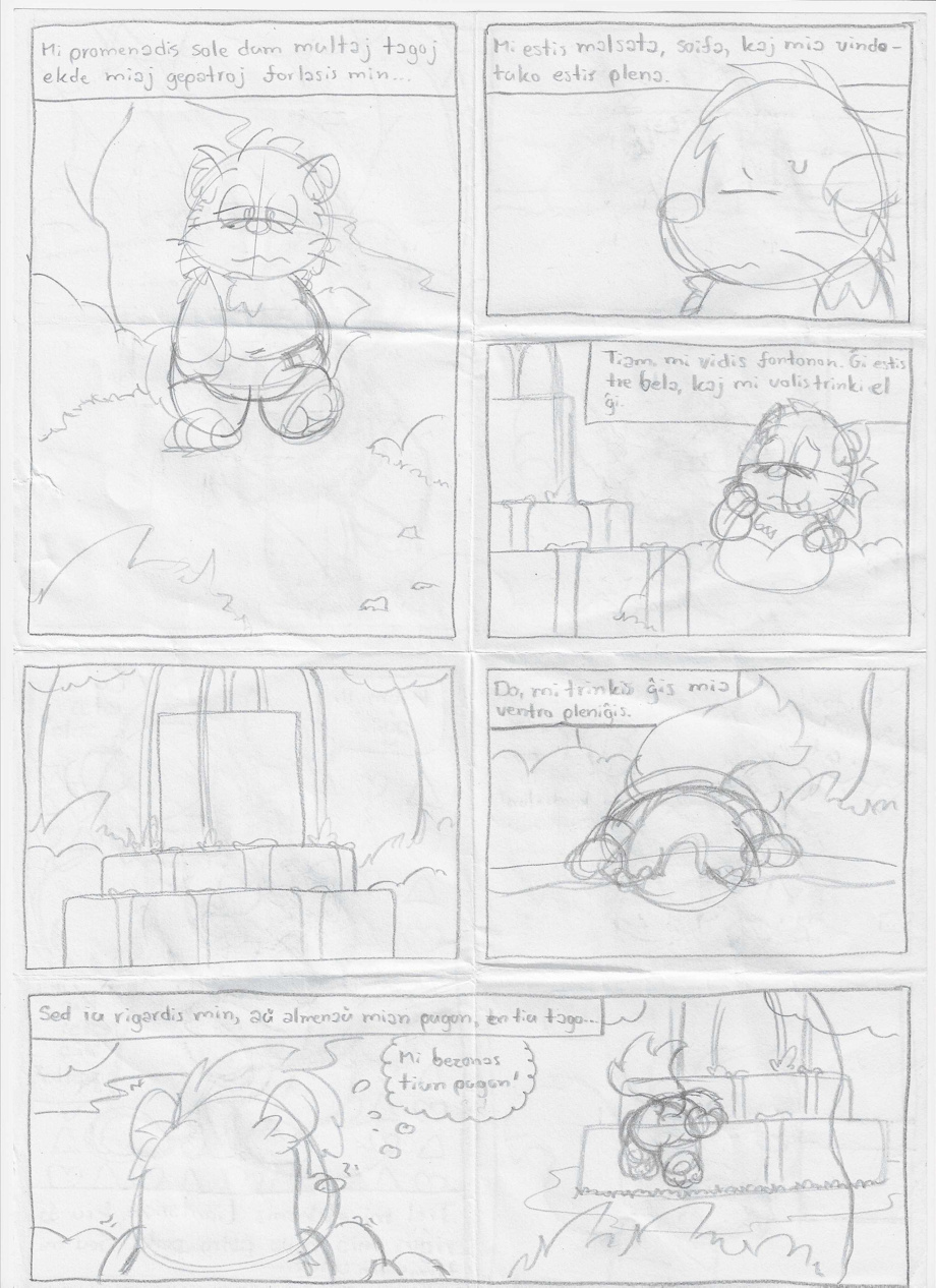 Mi promenadis sole dum multaj tagoj ekde miaj gepatroj forlasis min. Mi estis malsata, soifa, kaj mia vindotuko estis plena. Tiam, mi vidis fontonon. Ĝi estis tre bela, kaj mi volis trinki el ĝi. Do, mi trinkis ĝis mia ventro pleniĝis. Sed iu rigardis min, aŭ almenaŭ mian pugon, en tiu tago.