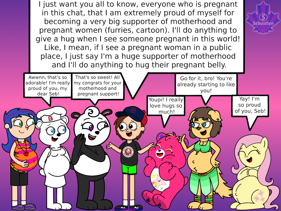 Here's a huge drawing about a talk about me (Mr.S, Seb) with six characters from left to tight: an unnamed oc i created by myself, El Osito Bimbo, Mama Panda, Be Me Bear, Asper and Fluttershy explaining that I'm very proud of myself to be a supporter of motherhood and pregnant bellies since March 4, 2024. ____________