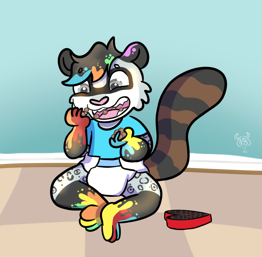 Hungry little hybrid boi gets into some chocolates. (commission)